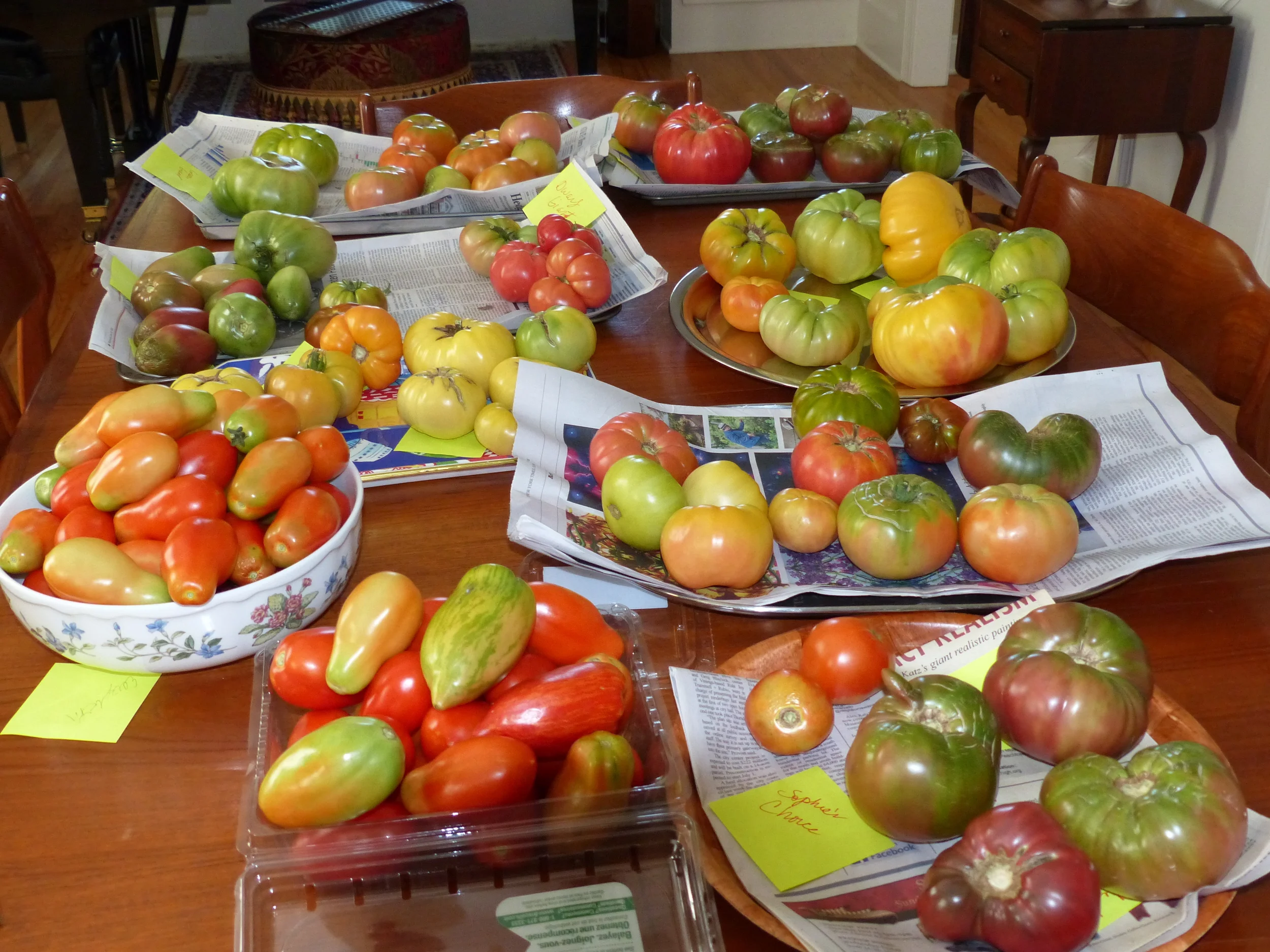 Those pictured above include Green Giant, Sweet Sue, Black Krim, Black from Tula, Black, Cherokee Purple, Purple Russian, Speckled Roma, Pineapple, Nepal, Prudens Purple and Amana Orange among others.