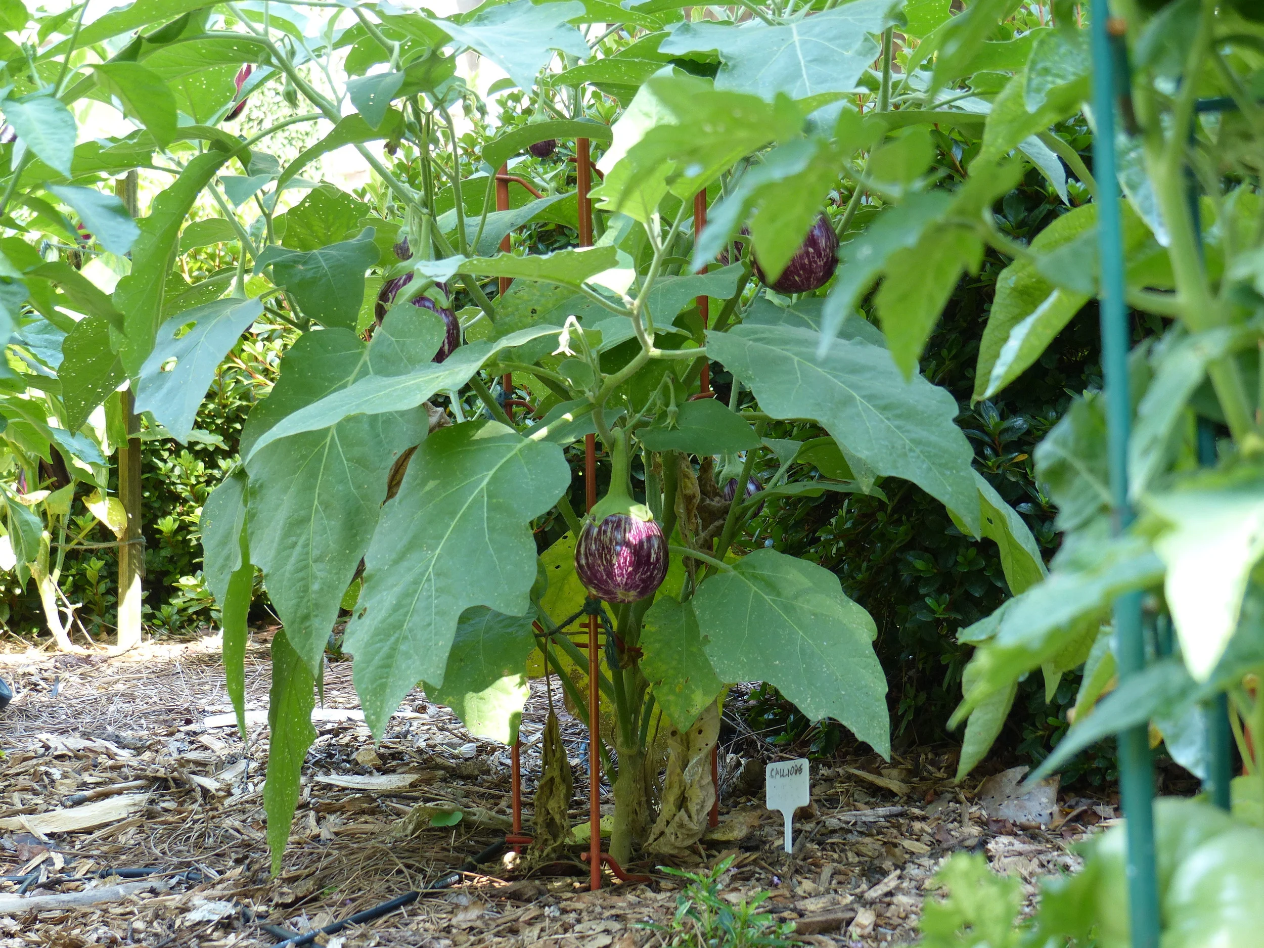Eggplants and peppers in the front yard are producing. Eggplant varieties include Japanese and Calliope.