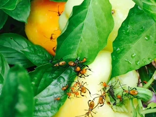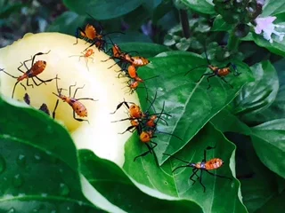 A couple weeks ago, I was just about to reach out and pick a pepper when I noticed what I thought was a swarm of red ants on the leaves and peppers. But wait—they had orange bodies and black legs. Not ants. And they were crawling all over the top of the plant. Out of respect, I left them alone and started looking at websites for “garden pests in Georgia.” InsectIdentification.org was quite helpful and where I found images of assassin bugs, both adults and nymphs, which are like the youngsters and adolescent-aged bugs. So these were assassin bug nymphs. At first, I thought, “ugh—how do I get rid of these before they bite me?” A bit more reading told me that they are a garden asset and will eat some of the more pesky insects that attack vegetables. So I let them be, and they’ve grown and changed to a greenish color that is more typical of the adults. I steer clear because I don’t want to sample their bite, which isn’t too painful but it can itch for several days, like a mosquito bite (to which I’m quite sensitive). And in the pictures below you can see that they are definitely not ants—and how their back ends are aimed up in the air!